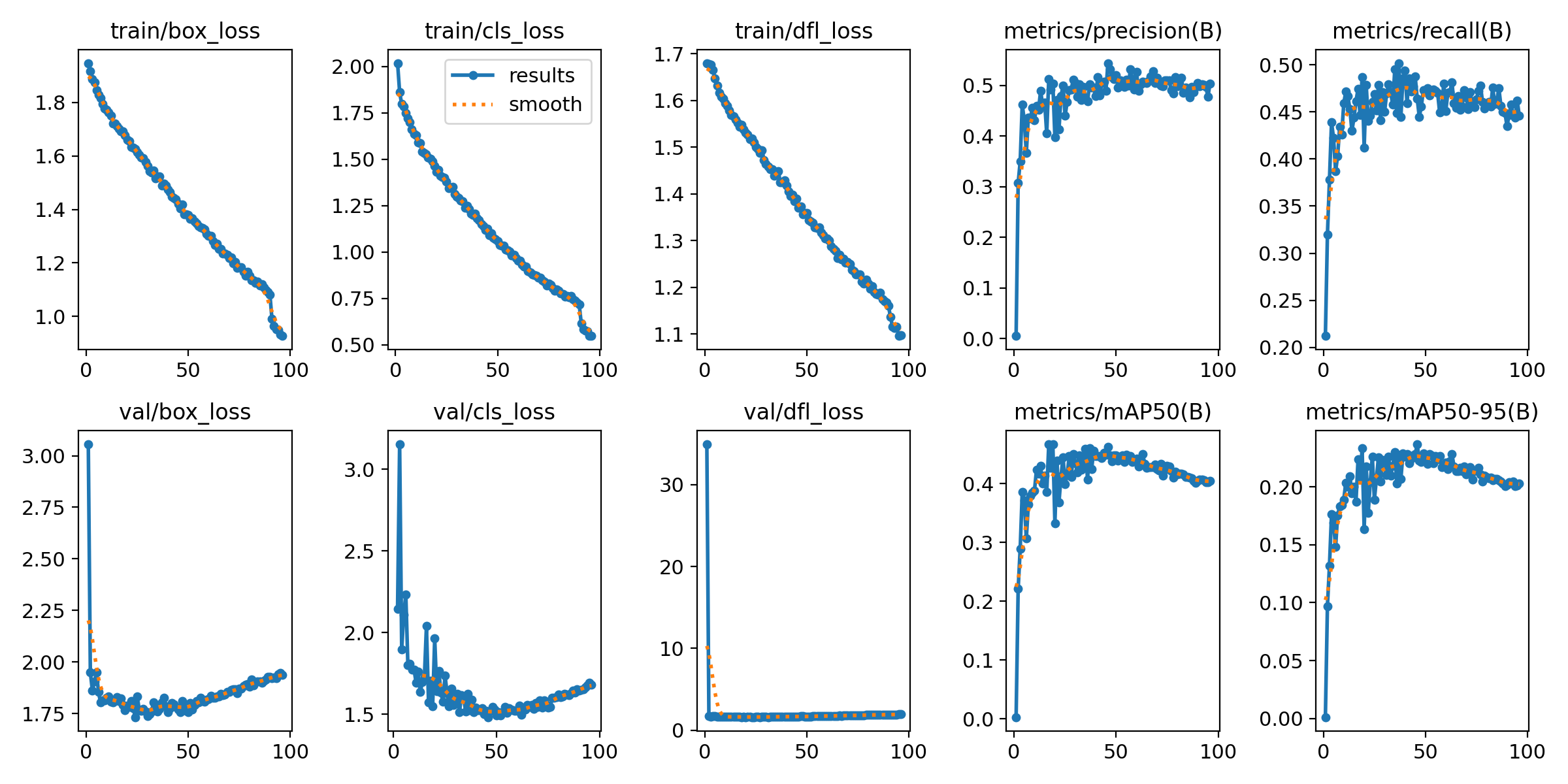 Die folgende Abbildung zeigt unseren Trainingsverlauf des YOLOv8-Modells mit Verlustfunktionen sowie den Leistungskennzahlen Precision, Recall und mAP über alle Epochen.